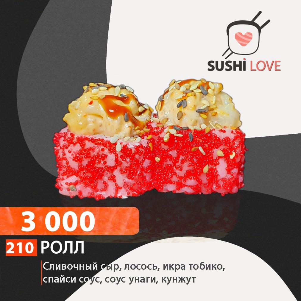 Сливочный сыр, лосось, спайси соус, тобико, соус унаги, кунжут